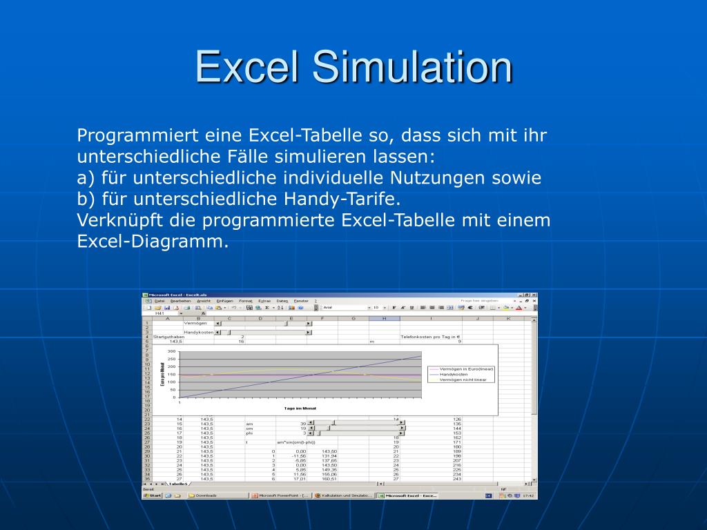 Excel Simulation Programmiert eine Excel-Tabelle so, dass sich mit ihr unterschiedliche Fälle simulieren lassen: a) für unterschiedliche individuelle Nutzungen sowie b) für unterschiedliche Handy-Tarife. Verknüpft die programmierte Excel-Tabelle mit einem Excel-Diagramm.