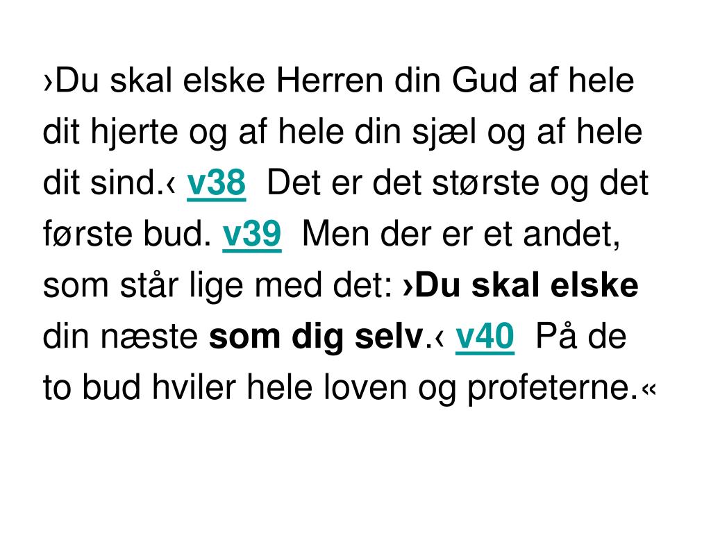 ›Du skal elske Herren din Gud af hele dit hjerte og af hele din sjæl og af hele dit sind.‹ v38 Det er det største og det første bud. v39 Men der er et andet, som står lige med det: ›Du skal elske din næste som dig selv.‹ v40 På de to bud hviler hele loven og profeterne.«