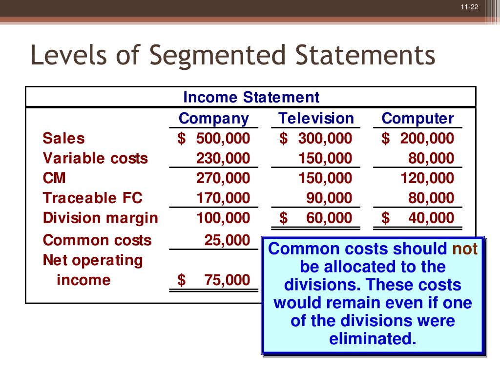 Levels of Segmented Statements Common costs should not be allocated to the divisions. These costs would remain even if one of the divisions were eliminated.