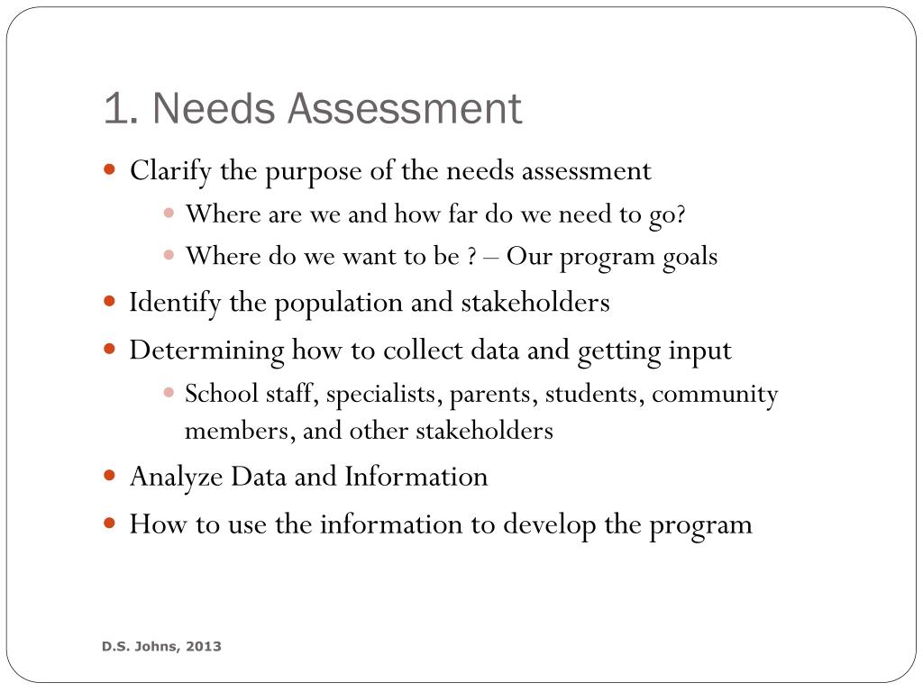 1. Needs Assessment • Clarify the purpose of the needs assessment • Where are we and how far do we need to go? • Where do we want to be ? – Our program goals • Identify the population and stakeholders • Determining how to collect data and getting input • School staff, specialists, parents, students, community members, and other stakeholders • Analyze Data and Information • How to use the information to develop the program D.S. Johns, 2013