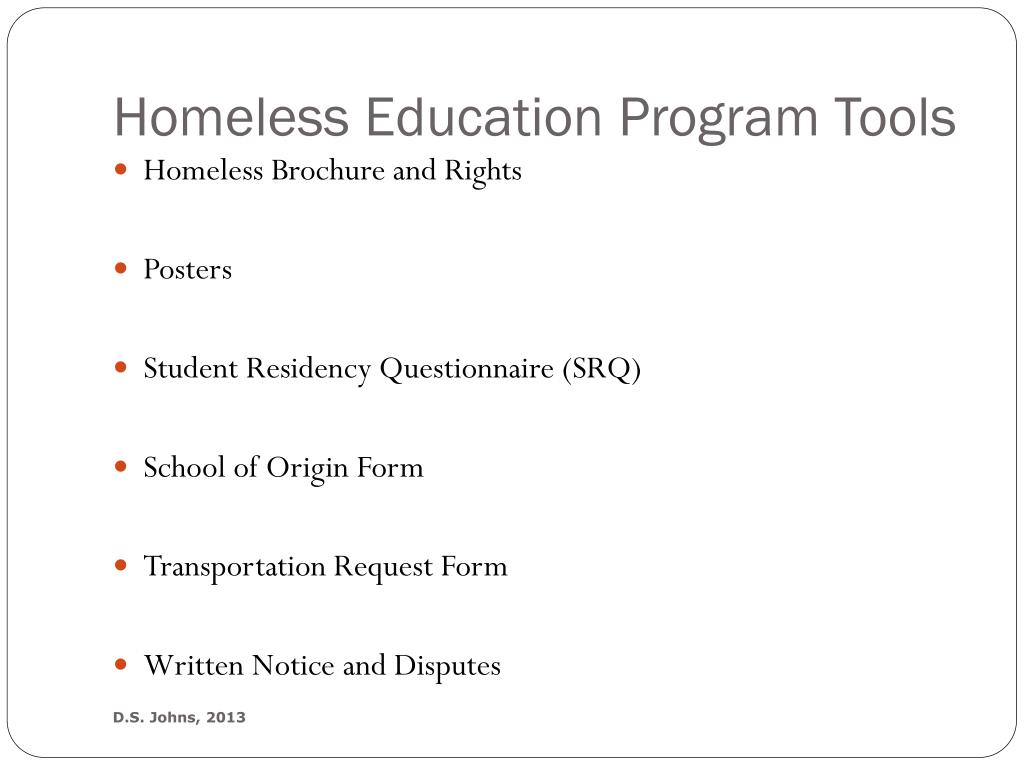 Homeless Education Program Tools • Homeless Brochure and Rights • Posters • Student Residency Questionnaire (SRQ) • School of Origin Form • Transportation Request Form • Written Notice and Disputes D.S. Johns, 2013