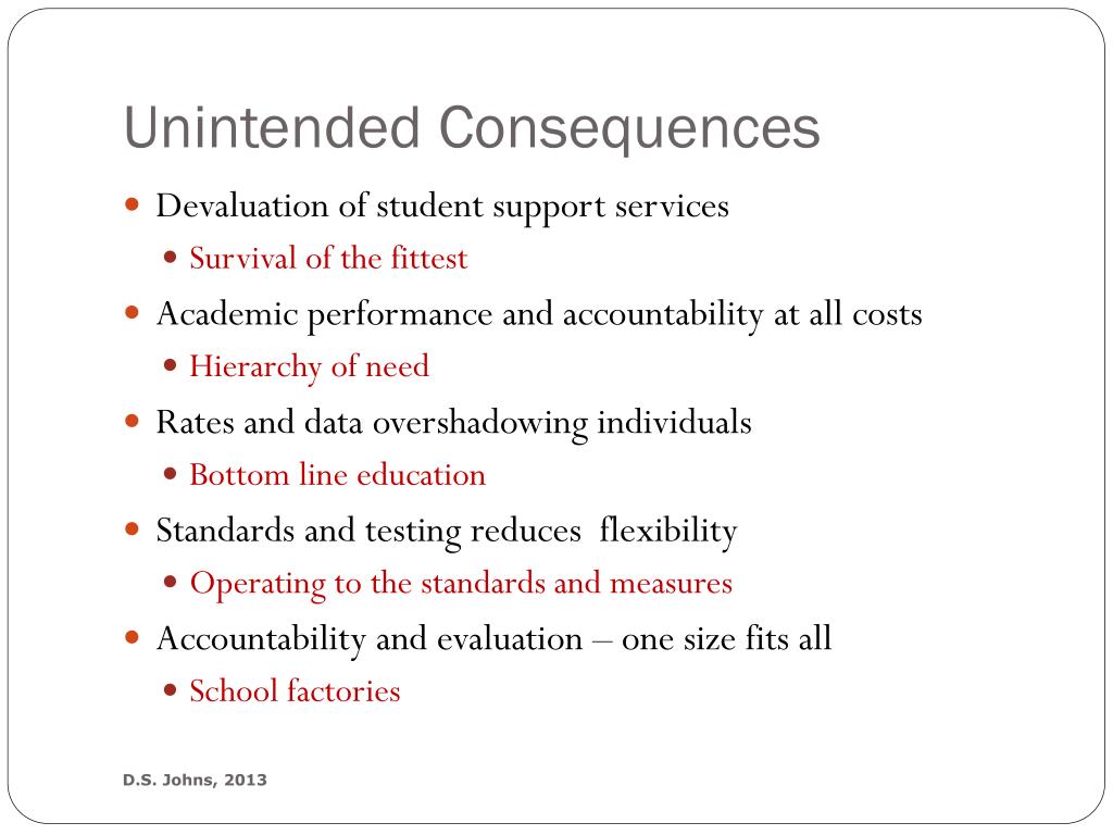 Unintended Consequences • Devaluation of student support services • Survival of the fittest • Academic performance and accountability at all costs • Hierarchy of need • Rates and data overshadowing individuals • Bottom line education • Standards and testing reduces flexibility • Operating to the standards and measures • Accountability and evaluation – one size fits all • School factories D.S. Johns, 2013