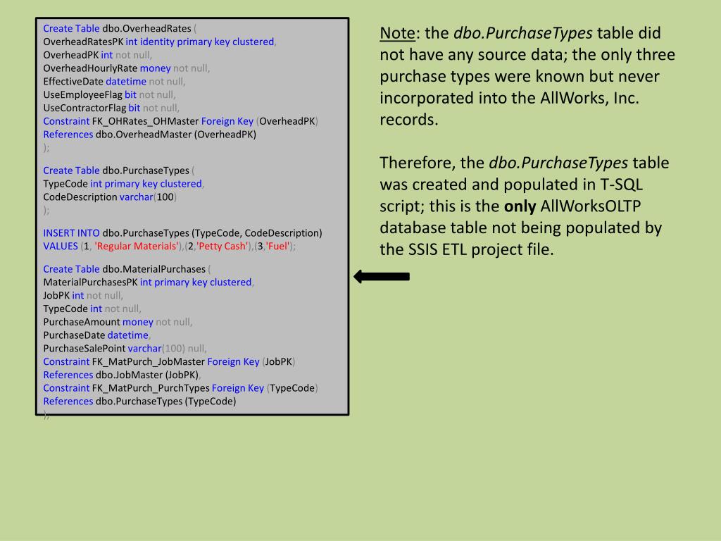Create Table dbo.OverheadRates( OverheadRatesPKint identity primary key clustered, OverheadPKintnot null, OverheadHourlyRatemoney not null, EffectiveDatedatetimenot null, UseEmployeeFlagbit not null, UseContractorFlagbit not null, Constraint FK_OHRates_OHMaster Foreign Key (OverheadPK) References dbo.OverheadMaster (OverheadPK) ); Create Table dbo.PurchaseTypes( TypeCodeint primary key clustered, CodeDescriptionvarchar(100) ); INSERT INTO dbo.PurchaseTypes (TypeCode, CodeDescription) VALUES (1, 'Regular Materials'),(2,'Petty Cash'),(3,'Fuel'); Create Table dbo.MaterialPurchases( MaterialPurchasesPKint primary key clustered, JobPKintnot null, TypeCodeintnot null, PurchaseAmountmoney not null, PurchaseDatedatetime, PurchaseSalePointvarchar(100) null, Constraint FK_MatPurch_JobMaster Foreign Key (JobPK) References dbo.JobMaster (JobPK), Constraint FK_MatPurch_PurchTypes Foreign Key (TypeCode) References dbo.PurchaseTypes (TypeCode) ); Note: the dbo.PurchaseTypes table did not have any source data; the only three purchase types were known but never incorporated into the AllWorks, Inc. records. Therefore, the dbo.PurchaseTypes table was created and populated in T-SQL script; this is the onlyAllWorksOLTP database table not being populated by the SSIS ETL project file.