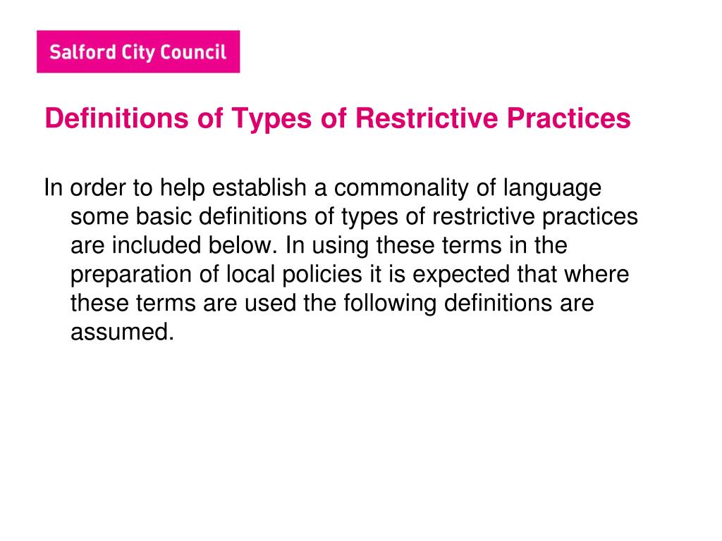 Definitions of Types of Restrictive Practices In order to help establish a commonality of language some basic definitions of types of restrictive practices are included below. In using these terms in the preparation of local policies it is expected that where these terms are used the following definitions are assumed.