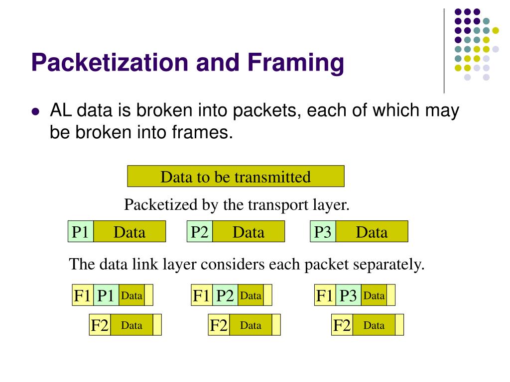Packetization and Framing • AL data is broken into packets, each of which may be broken into frames. Data to be transmitted Packetized by the transport layer. P1 Data P2 Data P3 Data The data link layer considers each packet separately. F1 P1 Data F1 P2 Data F1 P3 Data F2 Data F2 Data F2 Data