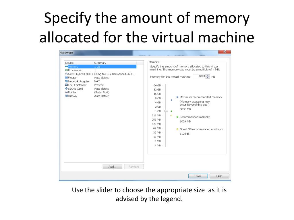 Specify the amount of memory allocated for the virtual machine Use the slider to choose the appropriate size as it is advised by the legend.