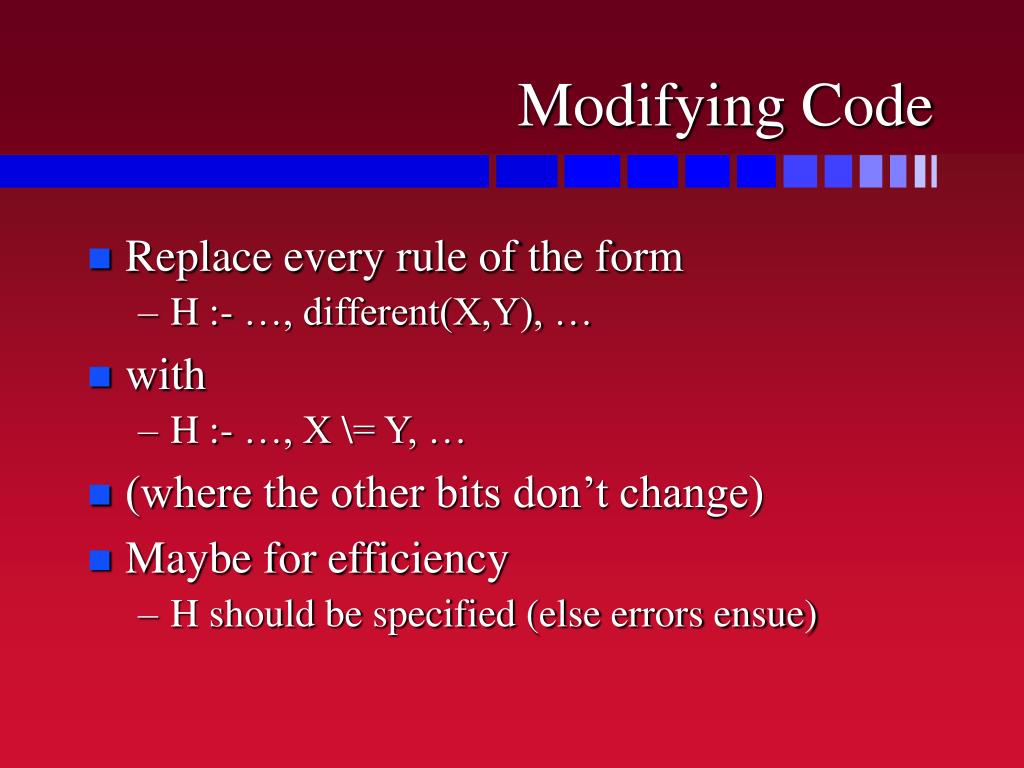 Modifying Code • Replace every rule of the form • H :- …, different(X,Y), … • with • H :- …, X \= Y, … • (where the other bits don’t change) • Maybe for efficiency • H should be specified (else errors ensue)