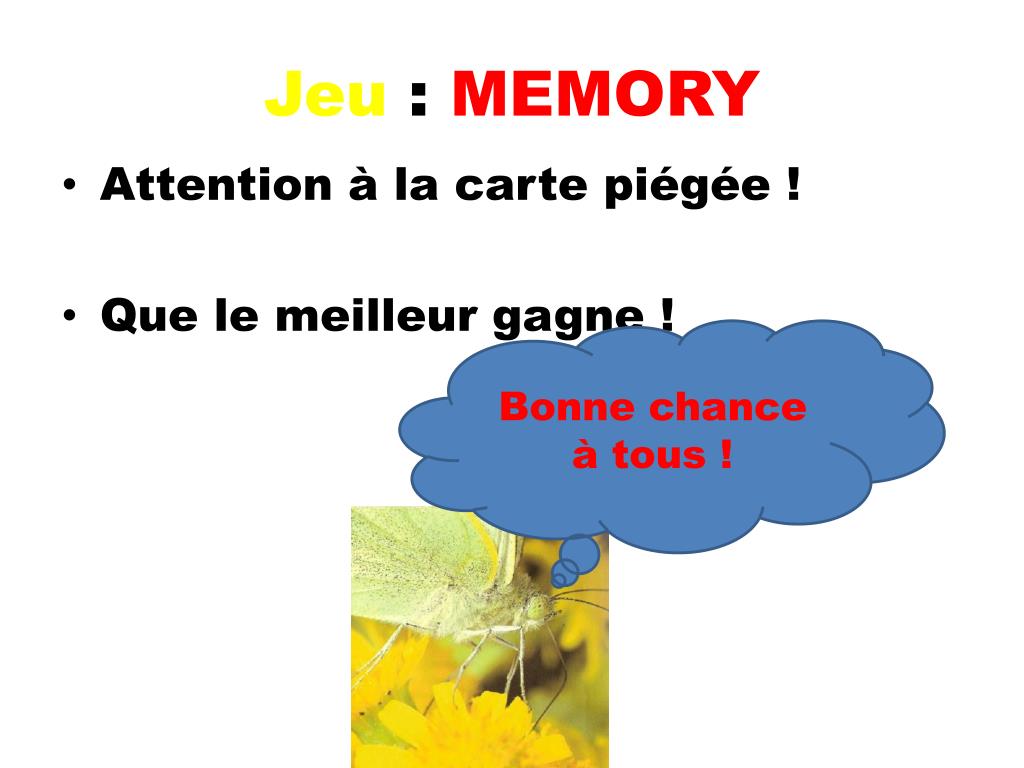 Jeu :MEMORY • Attention à la carte piégée ! • Que le meilleur gagne ! Bonne chance à tous !