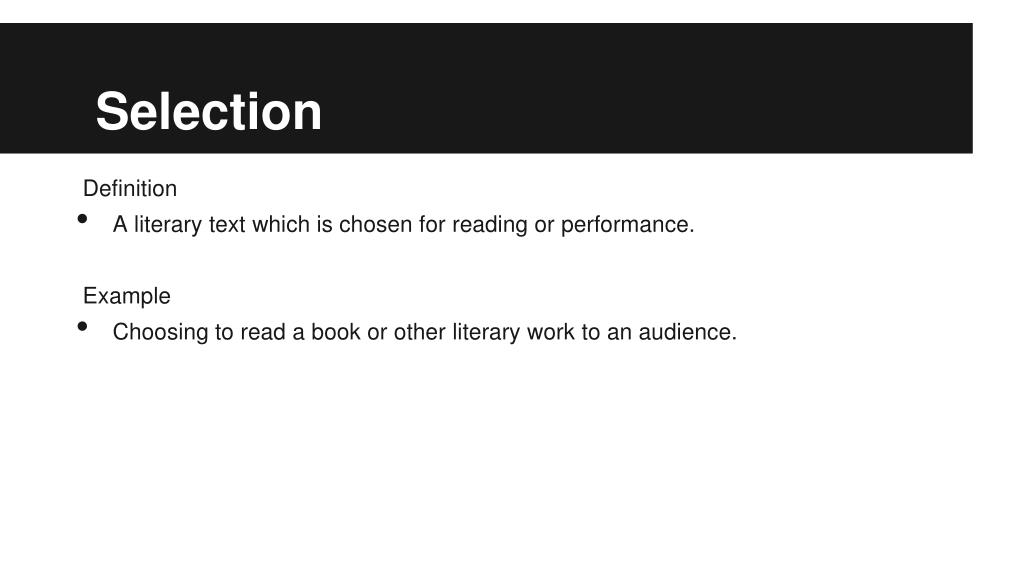 Selection Definition • A literary text which is chosen for reading or performance. Example • Choosing to read a book or other literary work to an audience.