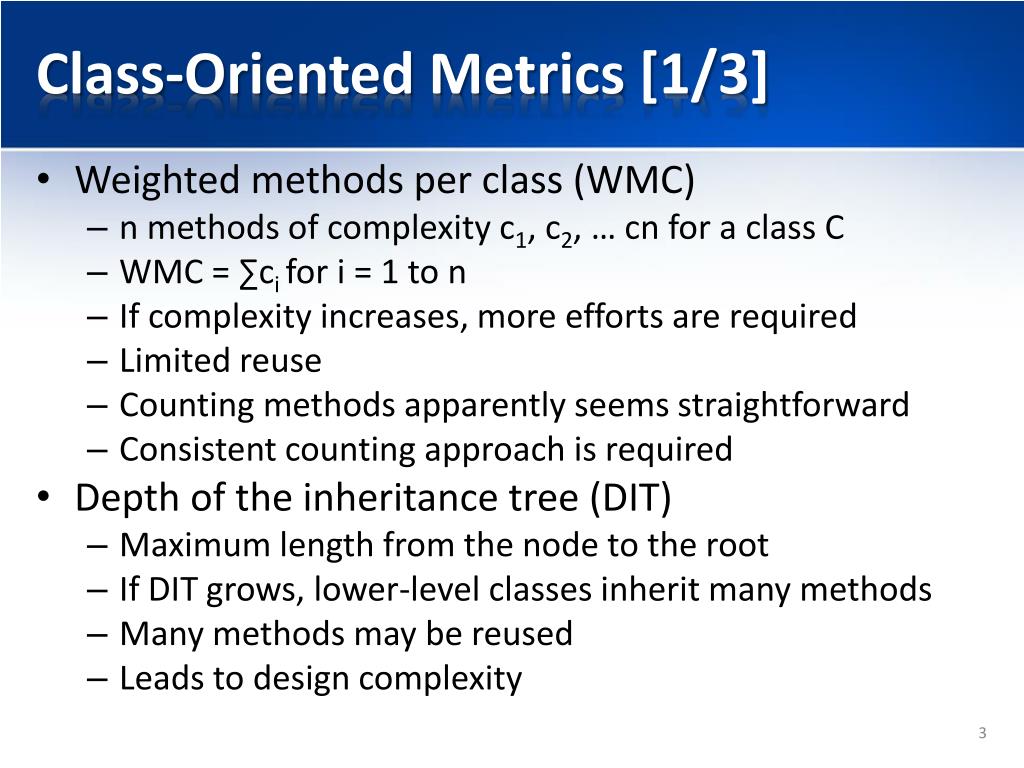 Class-Oriented Metrics [1/3] • Weighted methods per class (WMC) • n methods of complexity c1, c2, … cn for a class C • WMC = ∑ci for i = 1 to n • If complexity increases, more efforts are required • Limited reuse • Counting methods apparently seems straightforward • Consistent counting approach is required • Depth of the inheritance tree (DIT) • Maximum length from the node to the root • If DIT grows, lower-level classes inherit many methods • Many methods may be reused • Leads to design complexity