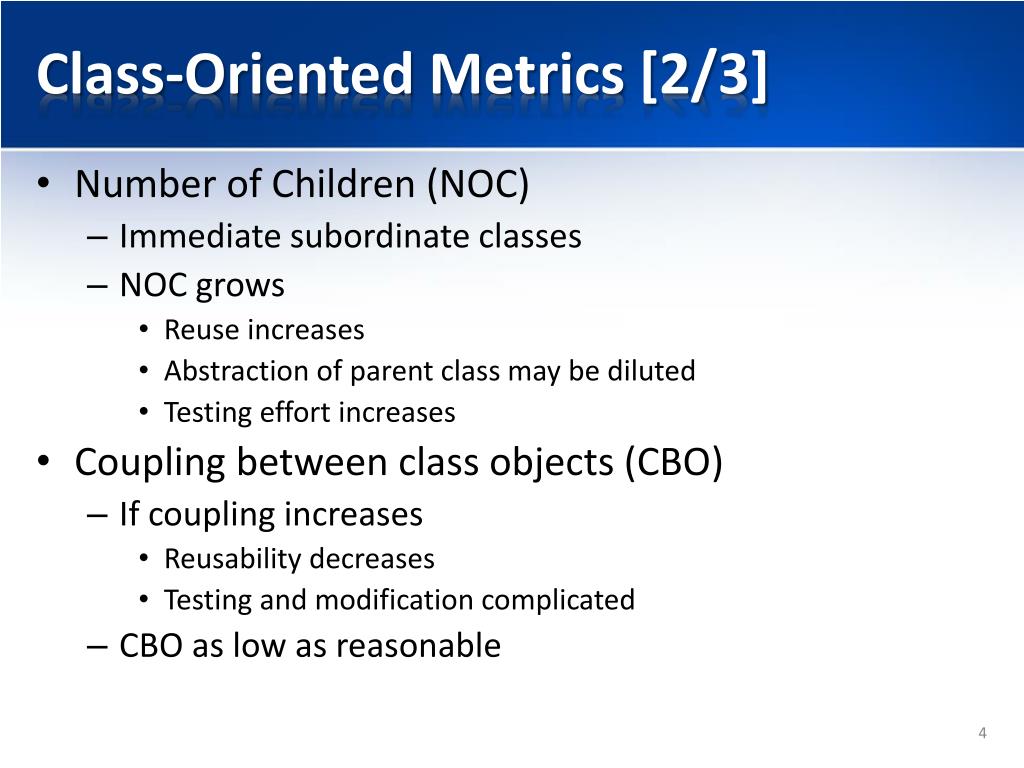 Class-Oriented Metrics [2/3] • Number of Children (NOC) • Immediate subordinate classes • NOC grows • Reuse increases • Abstraction of parent class may be diluted • Testing effort increases • Coupling between class objects (CBO) • If coupling increases • Reusability decreases • Testing and modification complicated • CBO as low as reasonable