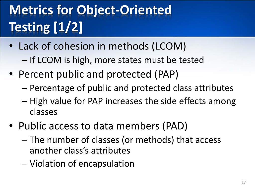 Metrics for Object-Oriented Testing [1/2] • Lack of cohesion in methods (LCOM) • If LCOM is high, more states must be tested • Percent public and protected (PAP) • Percentage of public and protected class attributes • High value for PAP increases the side effects among classes • Public access to data members (PAD) • The number of classes (or methods) that access another class’s attributes • Violation of encapsulation