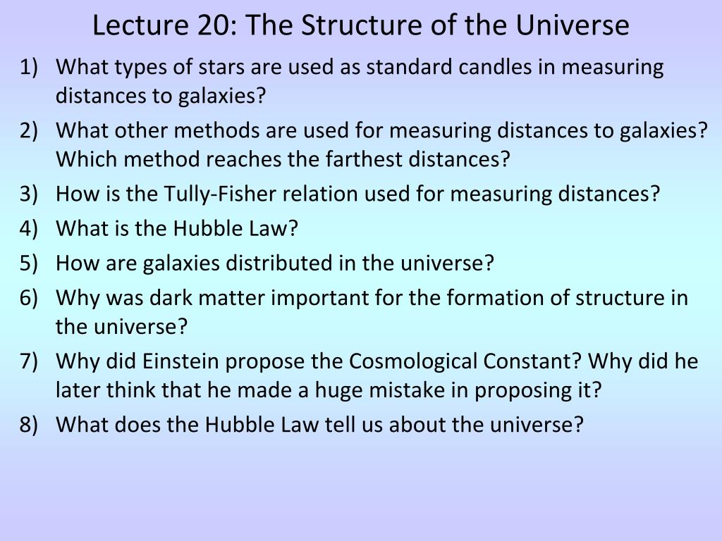 Lecture 20: The Structure of the Universe • What types of stars are used as standard candles in measuring distances to galaxies? • What other methods are used for measuring distances to galaxies? Which method reaches the farthest distances? • How is the Tully-Fisher relation used for measuring distances? • What is the Hubble Law? • How are galaxies distributed in the universe? • Why was dark matter important for the formation of structure in the universe? • Why did Einstein propose the Cosmological Constant? Why did he later think that he made a huge mistake in proposing it? • What does the Hubble Law tell us about the universe?