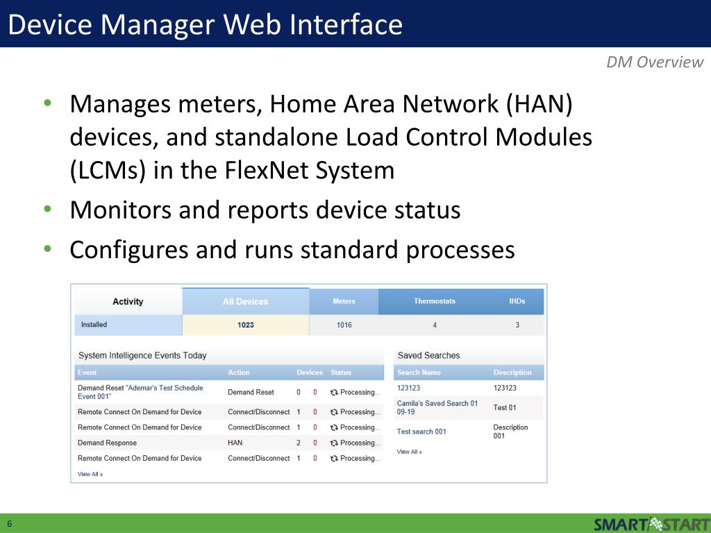 Device Manager Web Interface DM Overview Manages meters, Home Area Network (HAN) devices, and standalone Load Control Modules (LCMs) in the FlexNet System Monitors and reports device status Configures and runs standard processes