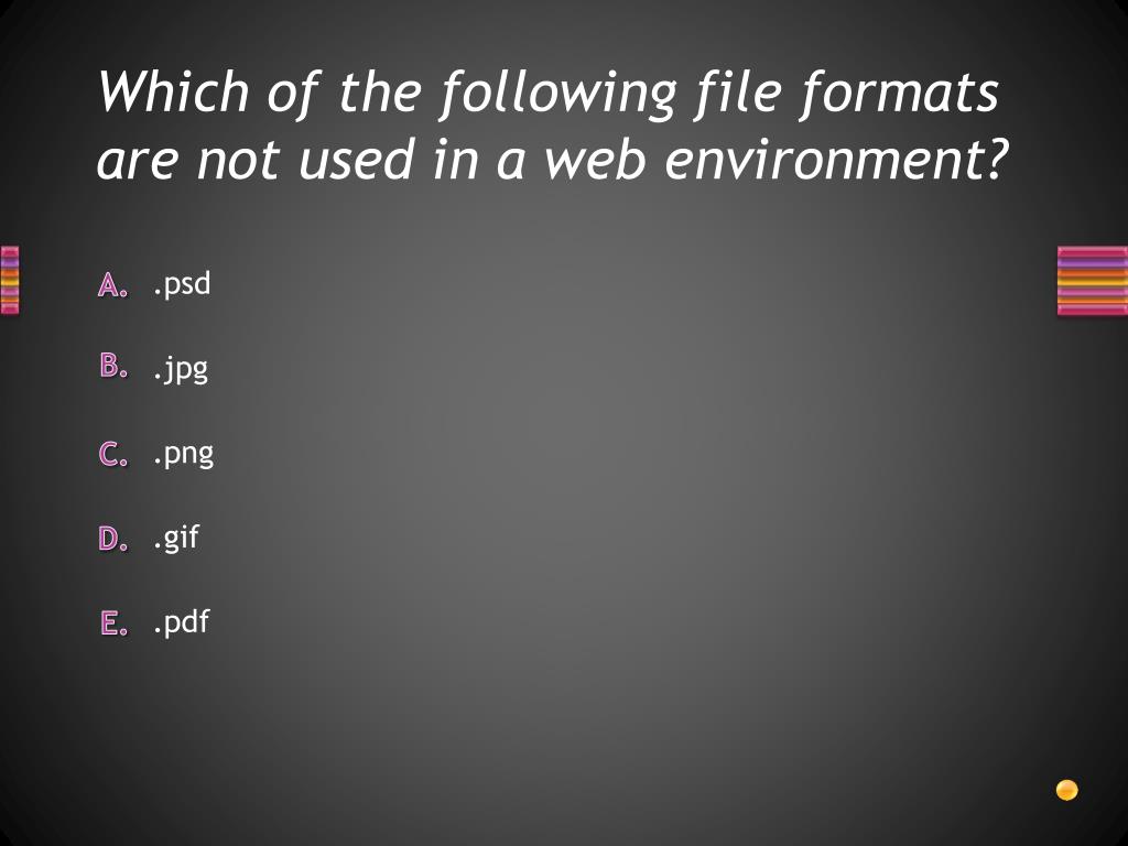 Which of the following file formats are not used in a web environment? .pdf .gif .png .jpg .psd