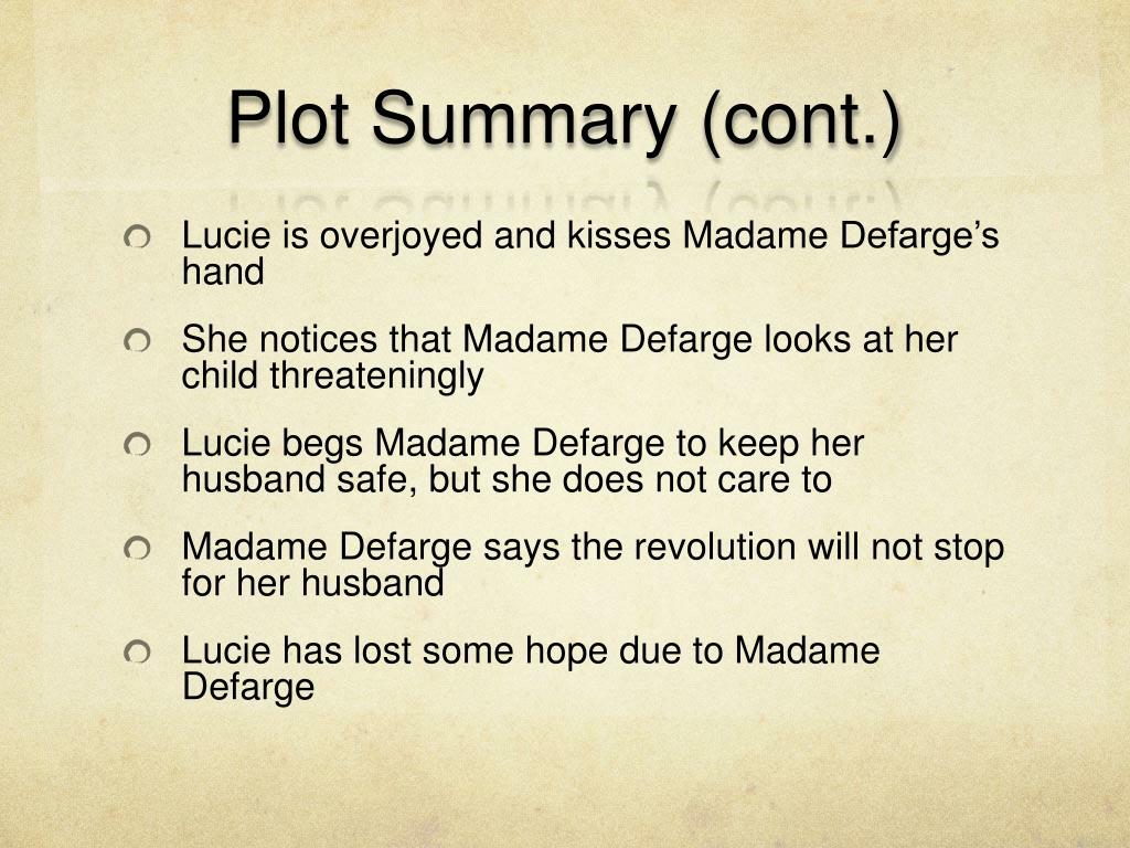 Plot Summary (cont.) • Lucie is overjoyed and kisses Madame Defarge’s hand • She notices that Madame Defarge looks at her child threateningly • Lucie begs Madame Defarge to keep her husband safe, but she does not care to • Madame Defarge says the revolution will not stop for her husband • Lucie has lost some hope due to Madame Defarge