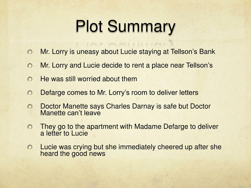 Plot Summary • Mr. Lorry is uneasy about Lucie staying at Tellson’s Bank • Mr. Lorry and Lucie decide to rent a place near Tellson’s • He was still worried about them • Defarge comes to Mr. Lorry’s room to deliver letters • Doctor Manette says Charles Darnay is safe but Doctor Manette can’t leave • They go to the apartment with Madame Defarge to deliver a letter to Lucie • Lucie was crying but she immediately cheered up after she heard the good news