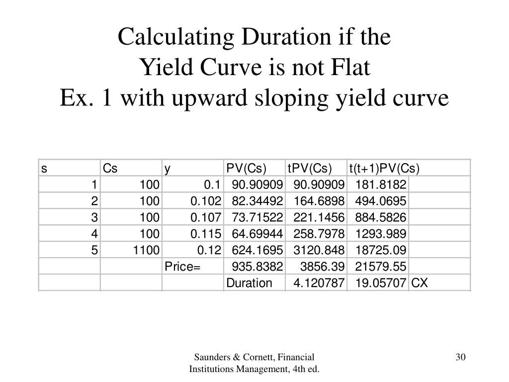 Calculating Duration if the Yield Curve is not FlatEx. 1 with upward sloping yield curve Saunders & Cornett, Financial Institutions Management, 4th ed.