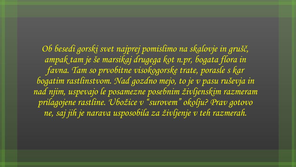 Ob besedi gorski svet najprej pomislimo na skalovje in grušč, ampak tam je še marsikaj drugega kot n.pr, bogata flora in favna. Tam so prvobitne visokogorske trate, porasle s kar bogatim rastlinstvom. Nad gozdno mejo, to je v pasu ruševja in nad njim, uspevajo le posamezne posebnim življenskim razmeram prilagojene rastline. Ubožice v “surovem” okolju? Prav gotovo ne, saj jih je narava usposobila za življenje v teh razmerah.