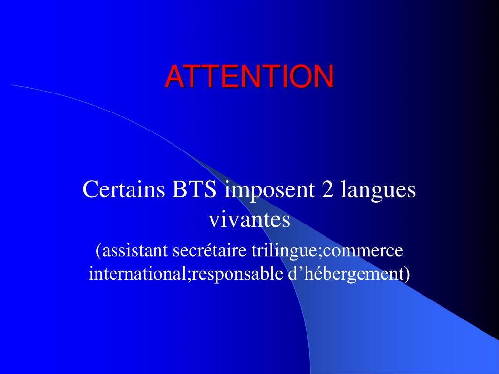ATTENTION Certains BTS imposent 2 langues vivantes (assistant secrétaire trilingue;commerce international;responsable d’hébergement)