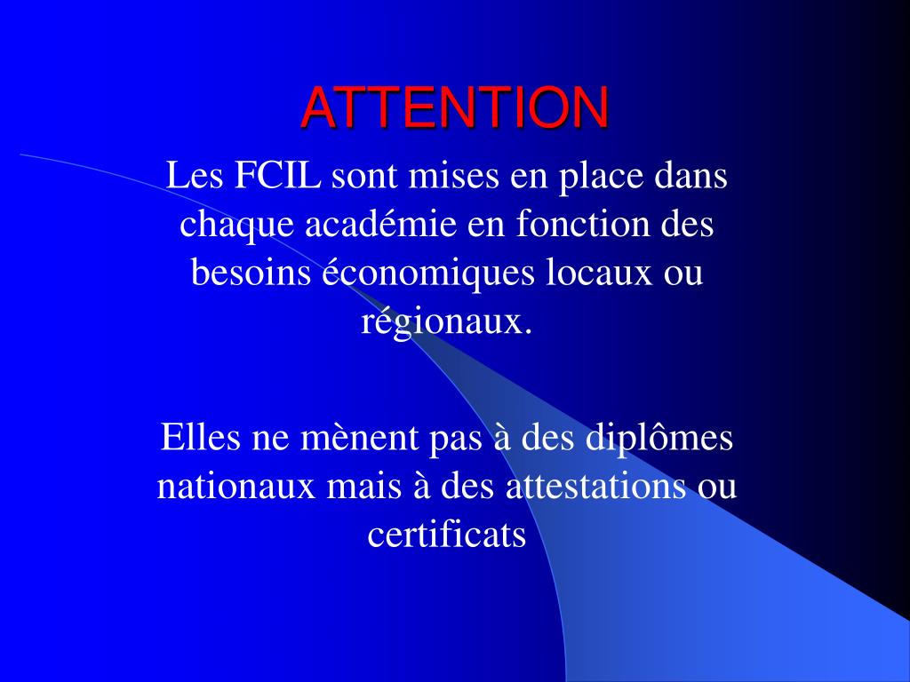 ATTENTION Les FCIL sont mises en place dans chaque académie en fonction des besoins économiques locaux ou régionaux. Elles ne mènent pas à des diplômes nationaux mais à des attestations ou certificats
