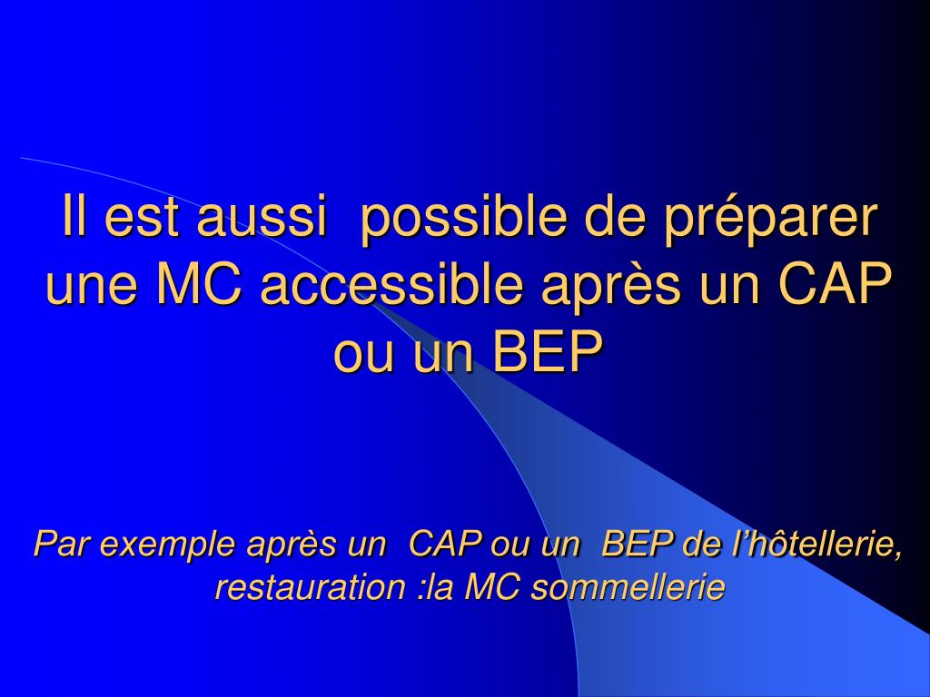 Il est aussi possible de préparer une MC accessible après un CAP ou un BEPPar exemple après un CAP ou un BEP de l’hôtellerie, restauration :la MC sommellerie