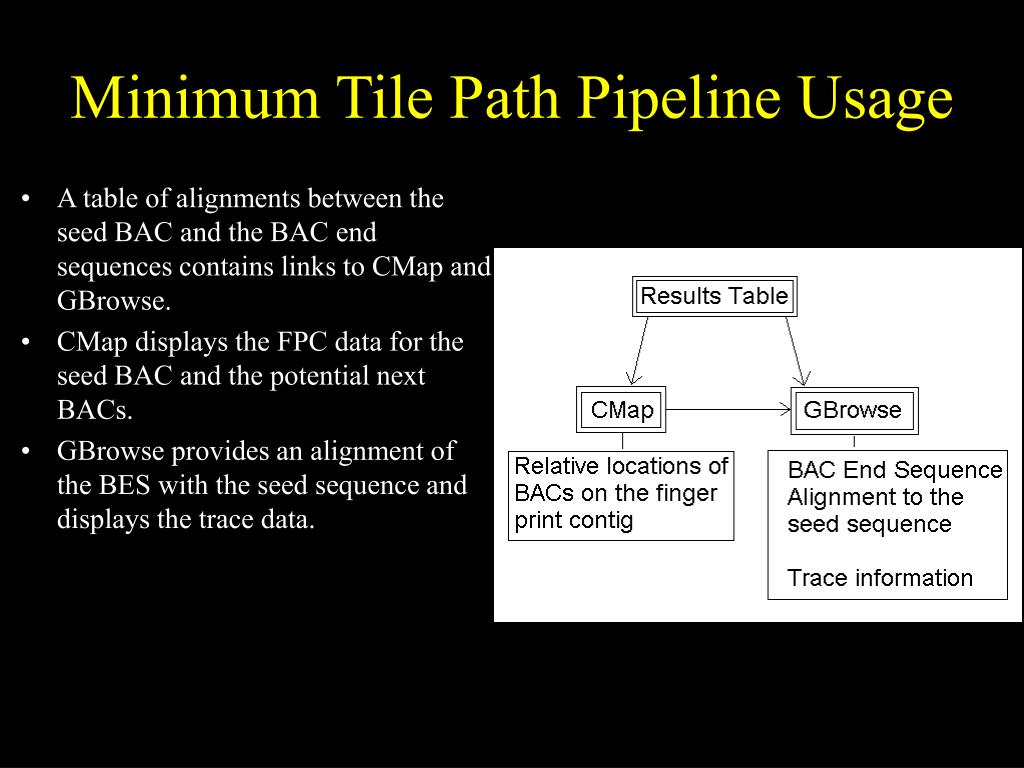 Minimum Tile Path Pipeline Usage • A table of alignments between the seed BAC and the BAC end sequences contains links to CMap and GBrowse. • CMap displays the FPC data for the seed BAC and the potential next BACs. • GBrowse provides an alignment of the BES with the seed sequence and displays the trace data.