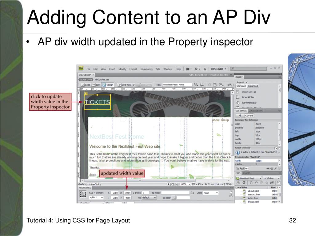 Adding Content to an AP Div • AP div width updated in the Property inspector Tutorial 4: Using CSS for Page Layout