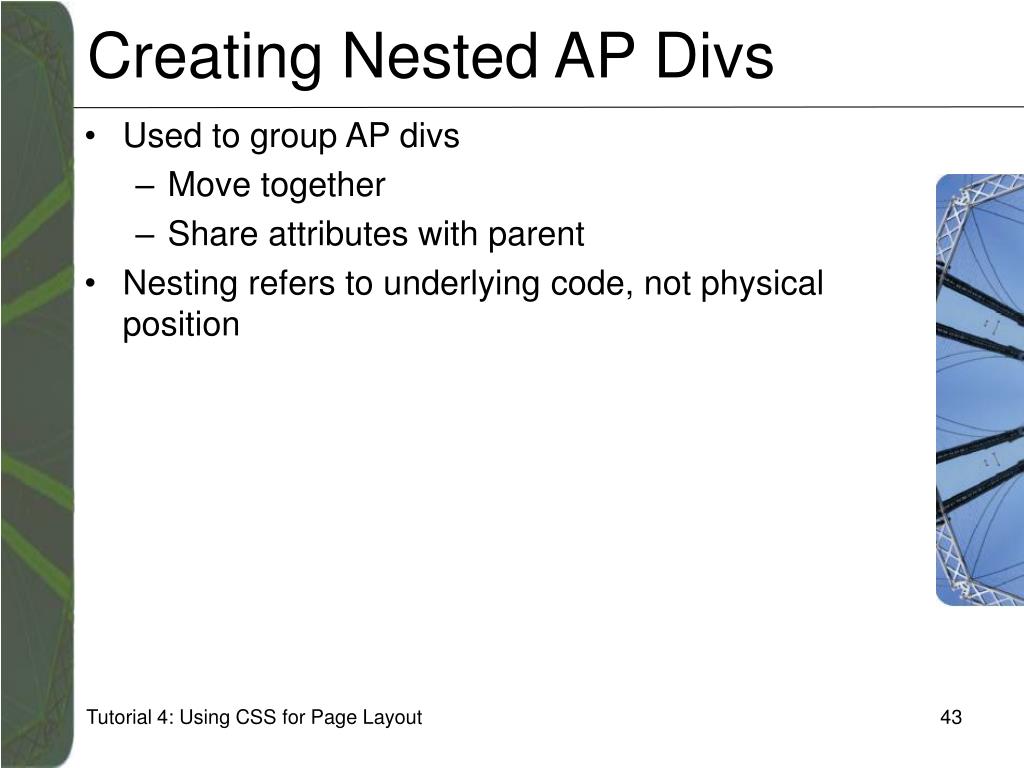 Creating Nested AP Divs • Used to group AP divs • Move together • Share attributes with parent • Nesting refers to underlying code, not physical position Tutorial 4: Using CSS for Page Layout