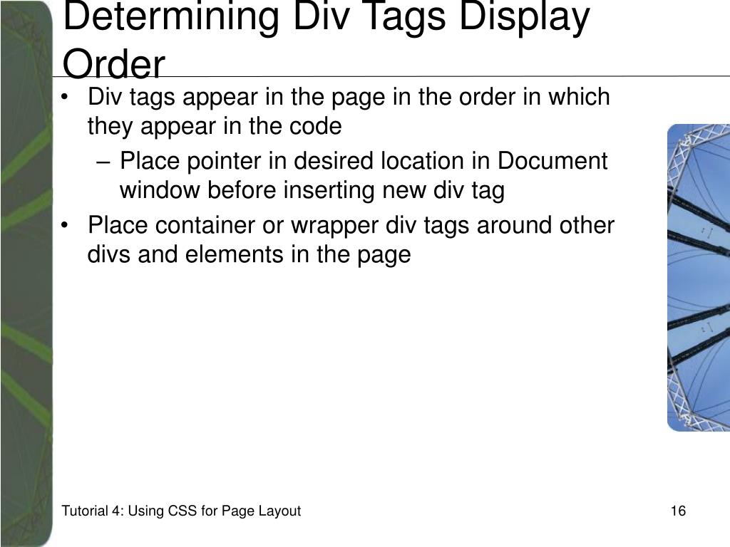 Determining Div Tags Display Order • Div tags appear in the page in the order in which they appear in the code • Place pointer in desired location in Document window before inserting new div tag • Place container or wrapper div tags around other divs and elements in the page Tutorial 4: Using CSS for Page Layout