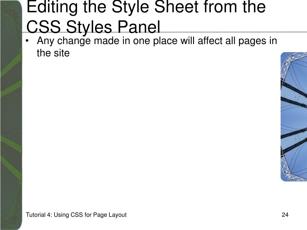 Editing the Style Sheet from the CSS Styles Panel • Any change made in one place will affect all pages in the site Tutorial 4: Using CSS for Page Layout