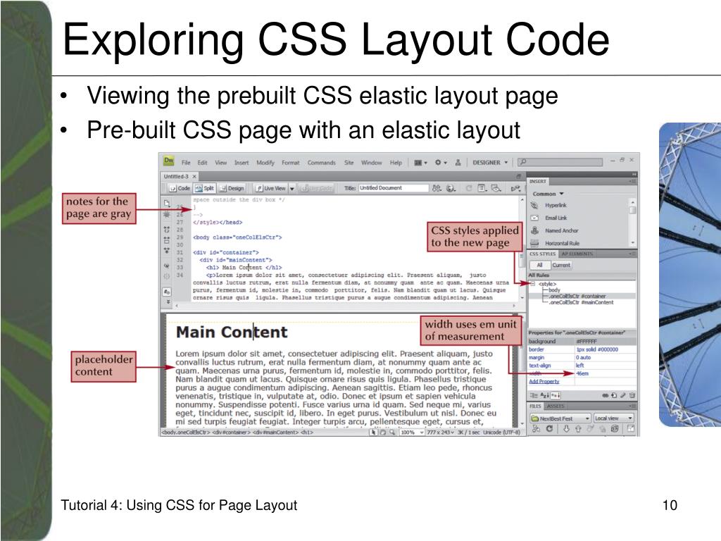 Tutorial 4: Using CSS for Page Layout. Session 4.1 Explore CSS layout Compare types of floating layouts Examine code for CSS layouts View prebuilt CSS layout pages Insert floating divs and nest divs Duplicate pages. Session 4.2 Draw AP divs Select, resize, and move AP divs