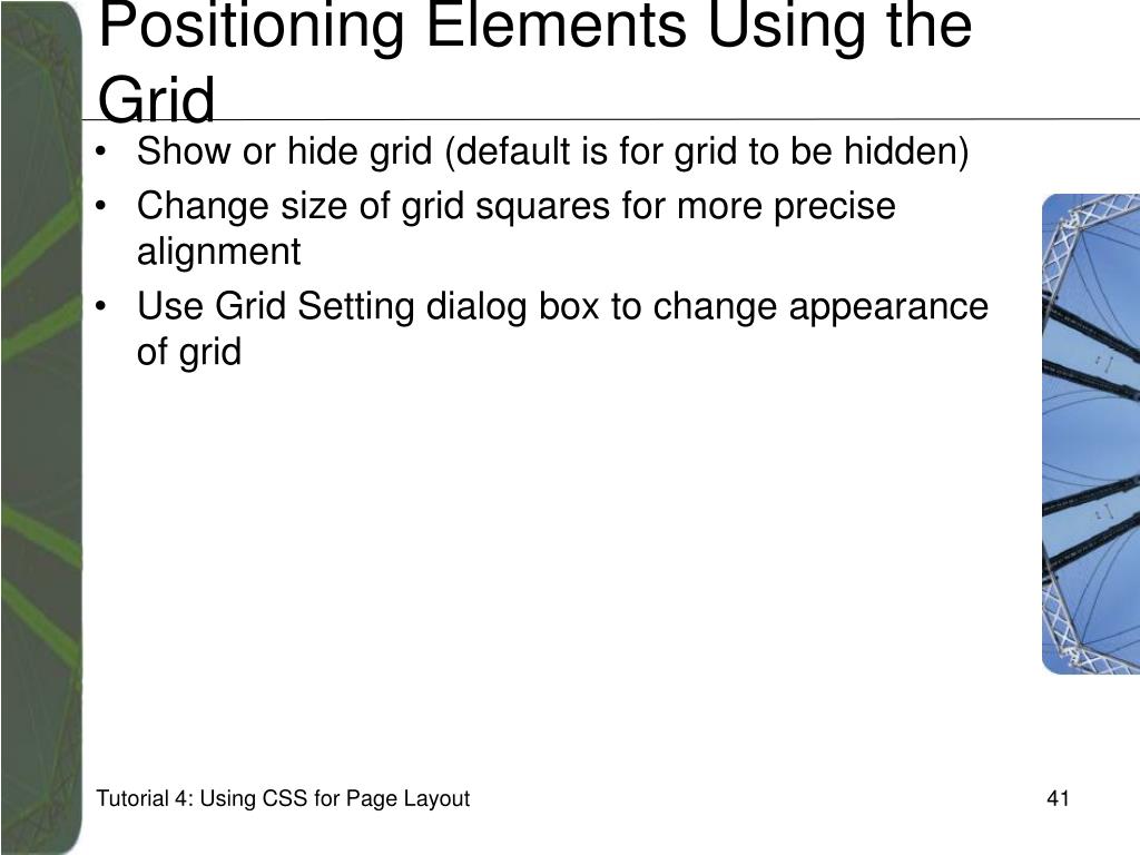 Positioning Elements Using the Grid • Show or hide grid (default is for grid to be hidden) • Change size of grid squares for more precise alignment • Use Grid Setting dialog box to change appearance of grid Tutorial 4: Using CSS for Page Layout