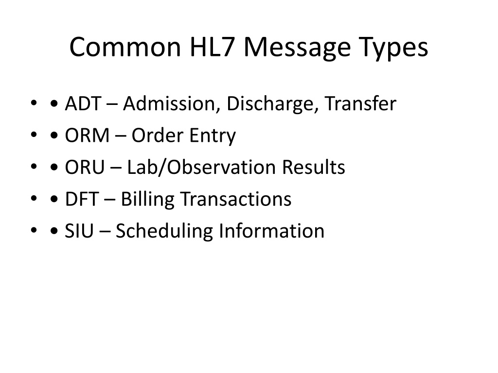 Common HL7 Message Types • • ADT – Admission, Discharge, Transfer • • ORM – Order Entry • • ORU – Lab/Observation Results • • DFT – Billing Transactions • • SIU – Scheduling Information