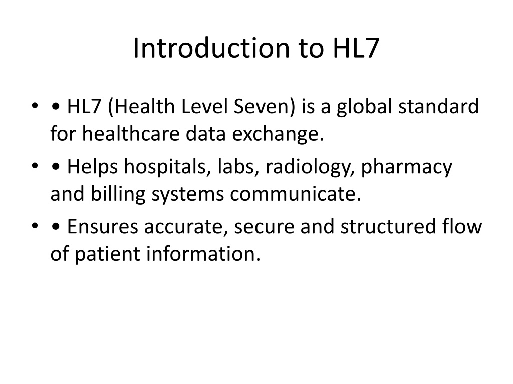 Introduction to HL7 • • HL7 (Health Level Seven) is a global standard for healthcare data exchange. • • Helps hospitals, labs, radiology, pharmacy and billing systems communicate. • • Ensures accurate, secure and structured flow of patient information.