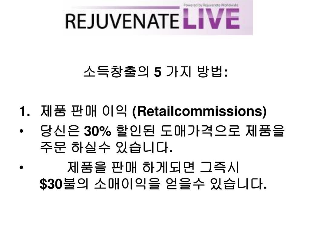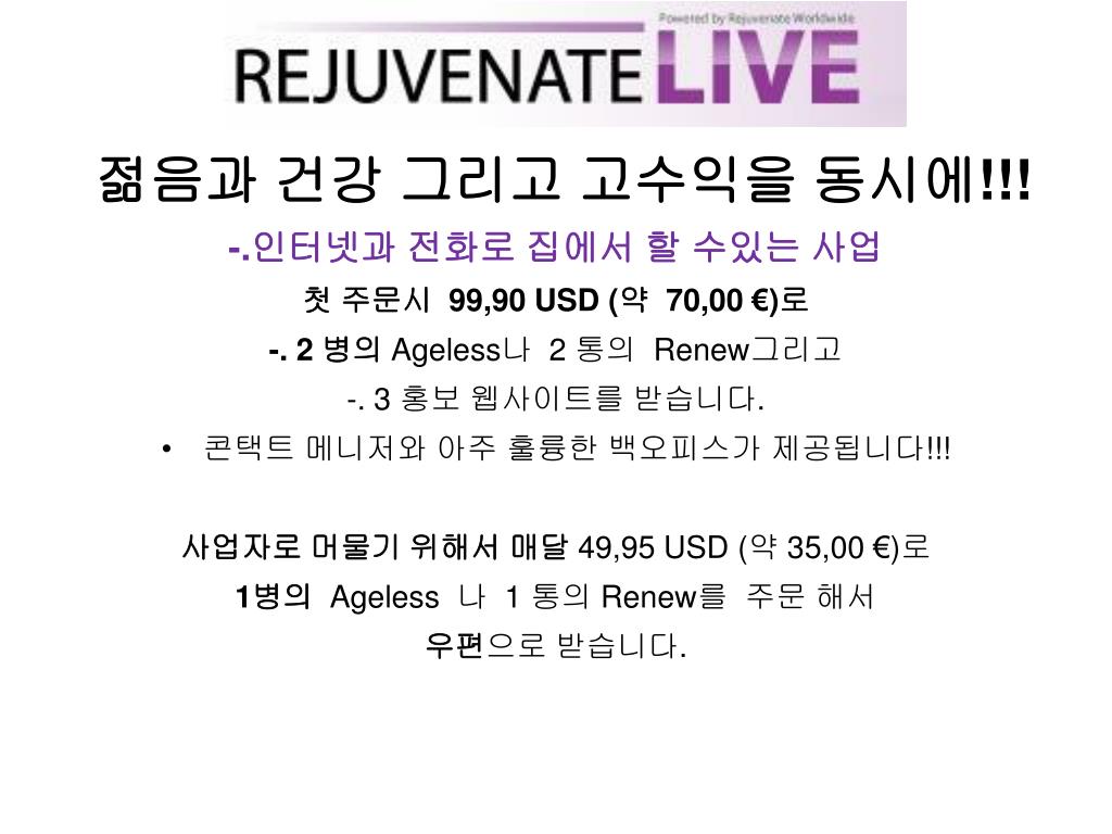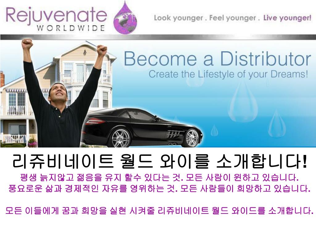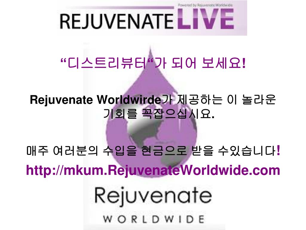“디스트리뷰터“가 되어 보세요! • Rejuvenate Worldwirde가 제공하는 이 놀라운 기회를 꼭잡으십시요. • 매주 여러분의 수입을 현금으로 받을 수있습니다! • http://mkum.RejuvenateWorldwide.com