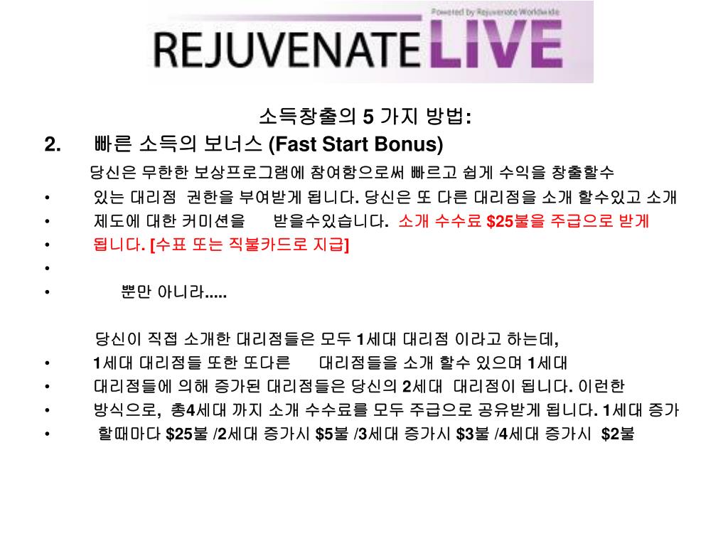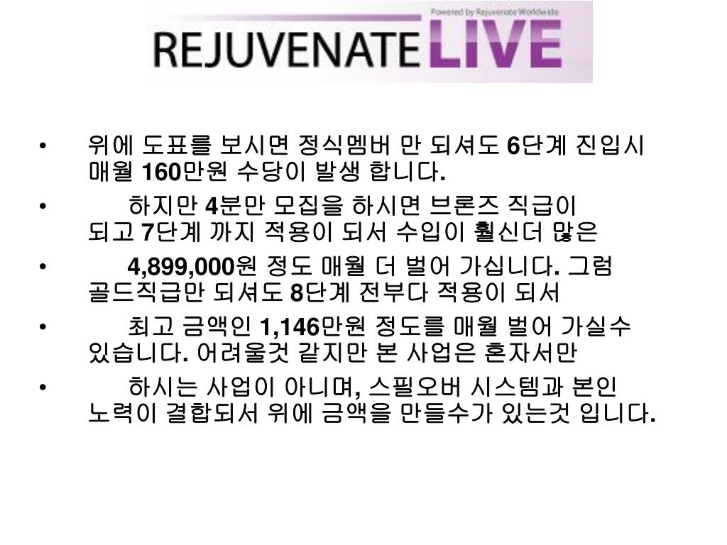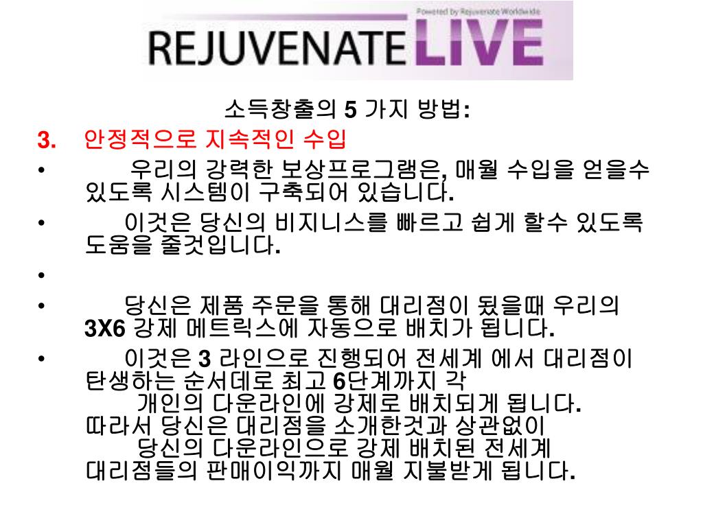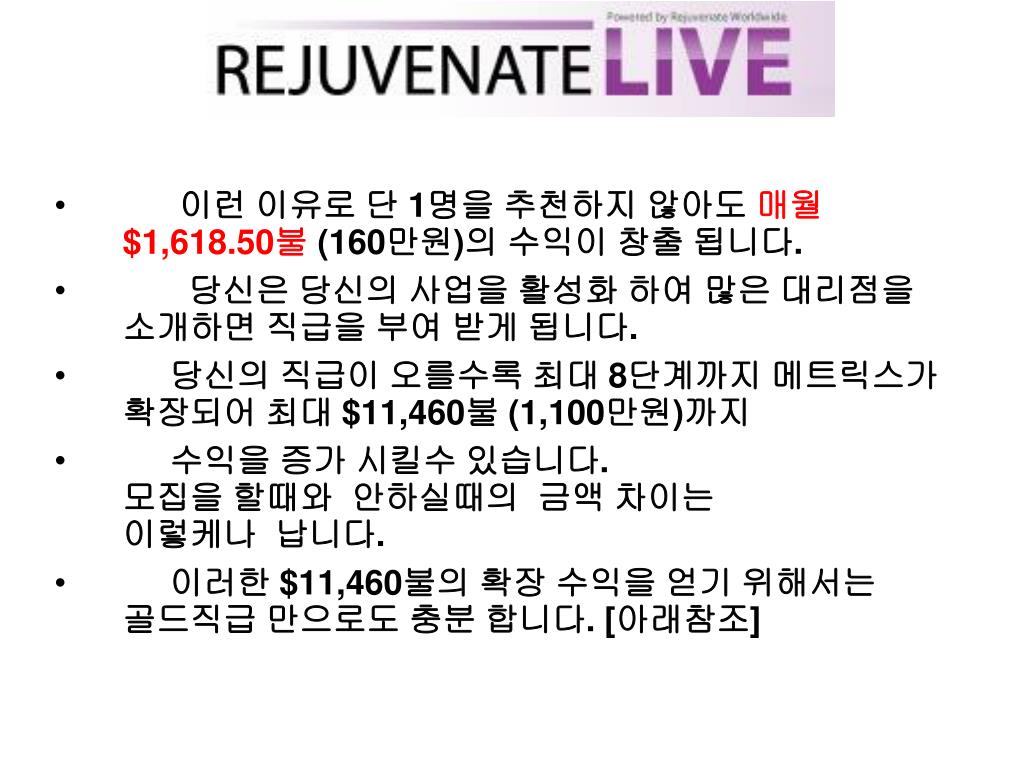 “디스트리뷰터“가 되어 보세요! • Rejuvenate Worldwirde가 제공하는 이 놀라운 기회를 꼭잡으십시요. • 매주 여러분의 수입을 현금으로 받을 수있습니다! • http://mkum.RejuvenateWorldwide.com