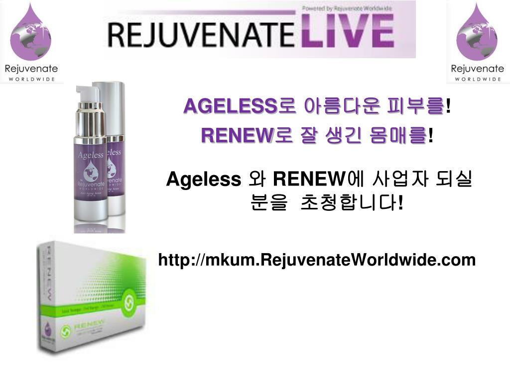 AGELESS로 아름다운 피부를! RENEW로 잘 생긴 몸매를! Ageless와 RENEW에 사업자 되실 분을 초청합니다! http://mkum.RejuvenateWorldwide.com