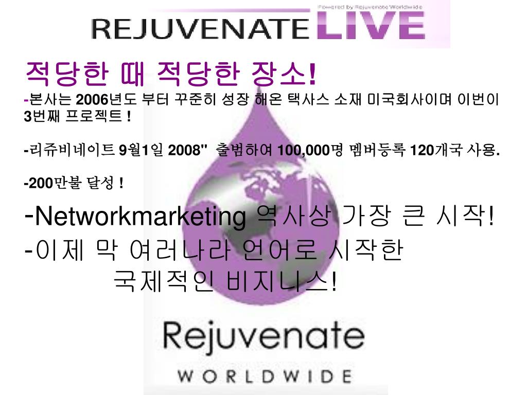 적당한 때 적당한 장소!-본사는 2006년도 부터 꾸준히 성장 해온 택사스 소재 미국회사이며 이번이 3번째 프로젝트 !-리쥬비네이트 9월1일 2008" 출범하여 100,000명 멤버등록 120개국 사용. -200만불 달성 !-Networkmarketing 역사상 가장 큰 시작!-이제 막 여러나라 언어로 시작한 국제적인 비지니스!