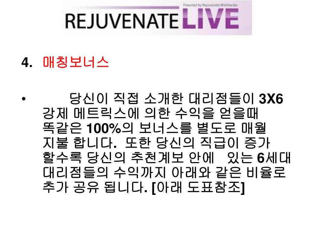 소득창출의 5 가지 방법: 3. 안정적으로 지속적인 수입 우리의 강력한 보상프로그램은, 매월 수입을 얻을수 있도록 시스템이 구축되어 있습니다. 이것은 당신의 비지니스를 빠르고 쉽게 할수 있도록 도움을 줄것입니다. 당신은 제품 주문을 통해 대리점이 됬을때 우리의 3X6 강제 메트릭스에 자동으로 배치가 됩니다. 이것은 3 라인으로 진행되어 전세계 에서 대리점이 탄생하는 순서데로 최고 6단계까지 각 개인의 다운라인에 강제로 배치되게 됩니다. 따라서 당신은 대리점을 소개한것과 상관없이 당신의 다운라인으로 강제 배치된 전세계 대리점들의 판매이익까지 매월 지불받게 됩니다.