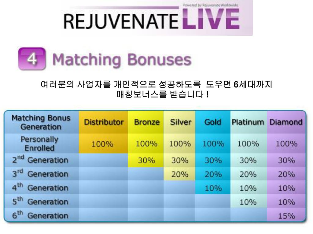 여러분의 사업자를 개인적으로 성공하도록 도우면 6세대까지 매칭보너스를 받습니다 !