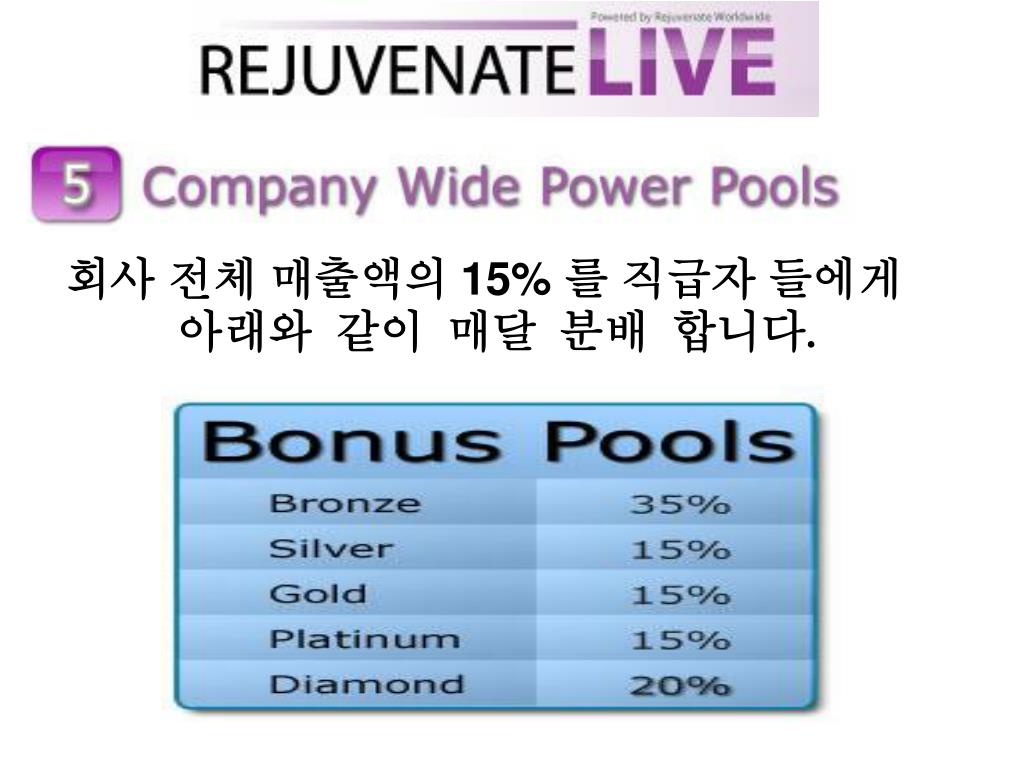 5. 직급자 공유 보너스 우리의 혁신적인 리더쉽을 통해 전세계 대리점들에 의한 회사 전체 매출액의 15% 를 직급자 들에게 공유 합니다. 이렇케 아주 강력한 방법으로 회사의 수익을 공유 함으로서 직급자들은 더 많은 소득을 매월창출 하게 될것 입니다.