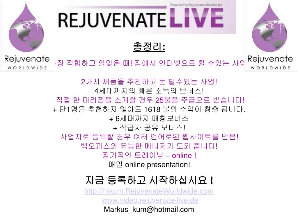총정리: • 가장 적합하고 알맞은 때! 집에서 인터넷으로 할 수있는 사업! • 2가지 제품을 추천하고 돈 벌수있는 사업! • 4세대까지의 빠른 소득의 보너스! • 직접 한 대리점을 소개할 경우 25불을 주급으로 받습니다! • + 단1명을 추천하지 않아도 1618 불의 수익이 창출 됩니다. • + 6세대까지 매칭보너스 • +직급자 공유 보너스! • 사업자로 등록할 경우 여러 언어로된 웹사이트를 받음! • 백오피스와 유능한 메니저가 도와 줍니다! • 정기적인 트레이닝 – online ! • 매일 online presentation! • 지금 등록하고 시작하십시요 ! • http://mkum.RejuvenateWorldwide.com • www.video.rejuvenate-live.de • Markus_kum@hotmail.com