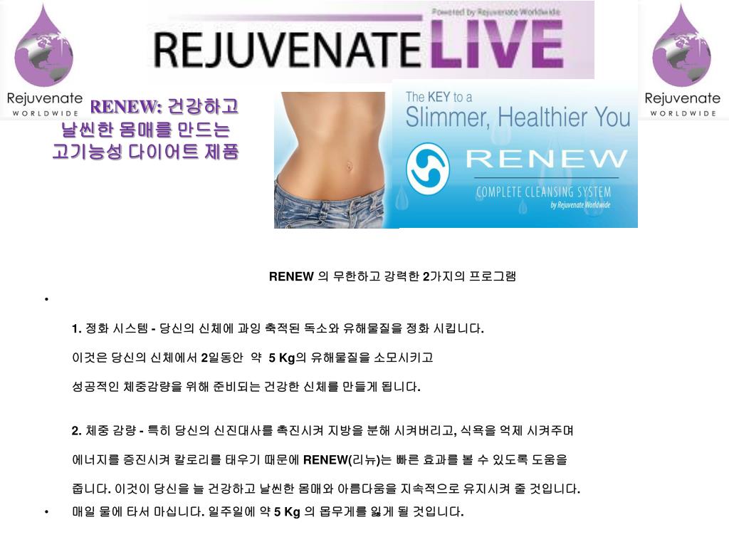 RENEW: 건강하고 날씬한 몸매를 만드는 고기능성 다이어트 제품 RENEW 의 무한하고 강력한 2가지의 프로그램 • 1. 정화 시스템 - 당신의 신체에 과잉 축적된 독소와 유해물질을 정화 시킵니다. 이것은 당신의 신체에서 2일동안 약 5 Kg의 유해물질을 소모시키고 성공적인 체중감량을 위해 준비되는 건강한 신체를 만들게 됩니다. 2. 체중 감량 - 특히 당신의 신진대사를 촉진시켜 지방을 분해 시켜버리고, 식욕을 억제 시켜주며 에너지를 증진시켜 칼로리를 태우기 때문에 RENEW(리뉴)는 빠른 효과를 볼 수 있도록 도움을 줍니다. 이것이 당신을 늘 건강하고 날씬한 몸매와 아름다움을 지속적으로 유지시켜 줄 것입니다. • 매일 물에 타서 마십니다. 일주일에 약 5 Kg 의 몹무게를 잃게 될 것입니다.