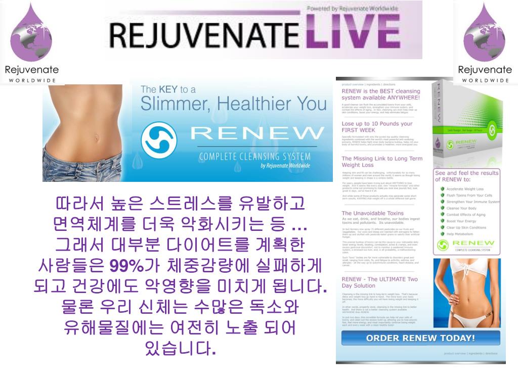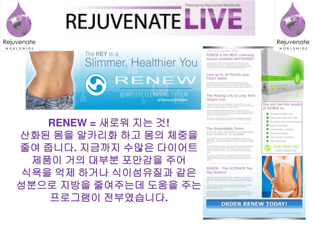 RENEW = 새로워 지는 것! 산화된 몸을 알카리화 하고 몸의 체중을 줄여 줍니다. 지금까지 수많은 다이어트 제품이 거의 대부분 포만감을 주어 식욕을 억제 하거나 식이섬유질과 같은 성분으로 지방을 줄여주는데 도움을 주는 프로그램이 전부였습니다.