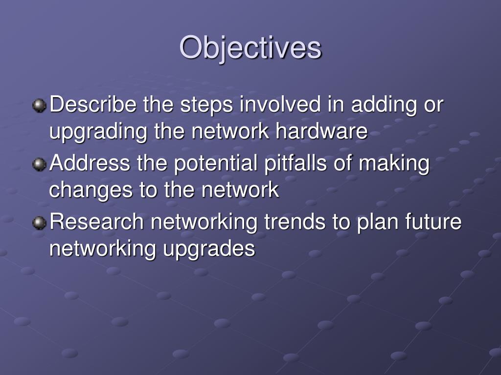 Objectives • Describe the steps involved in adding or upgrading the network hardware • Address the potential pitfalls of making changes to the network • Research networking trends to plan future networking upgrades