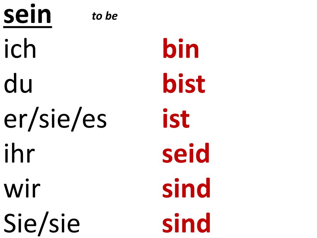 sein ich bin du bist er/sie/es ist ihr seid wir sind Sie/sie sind to be