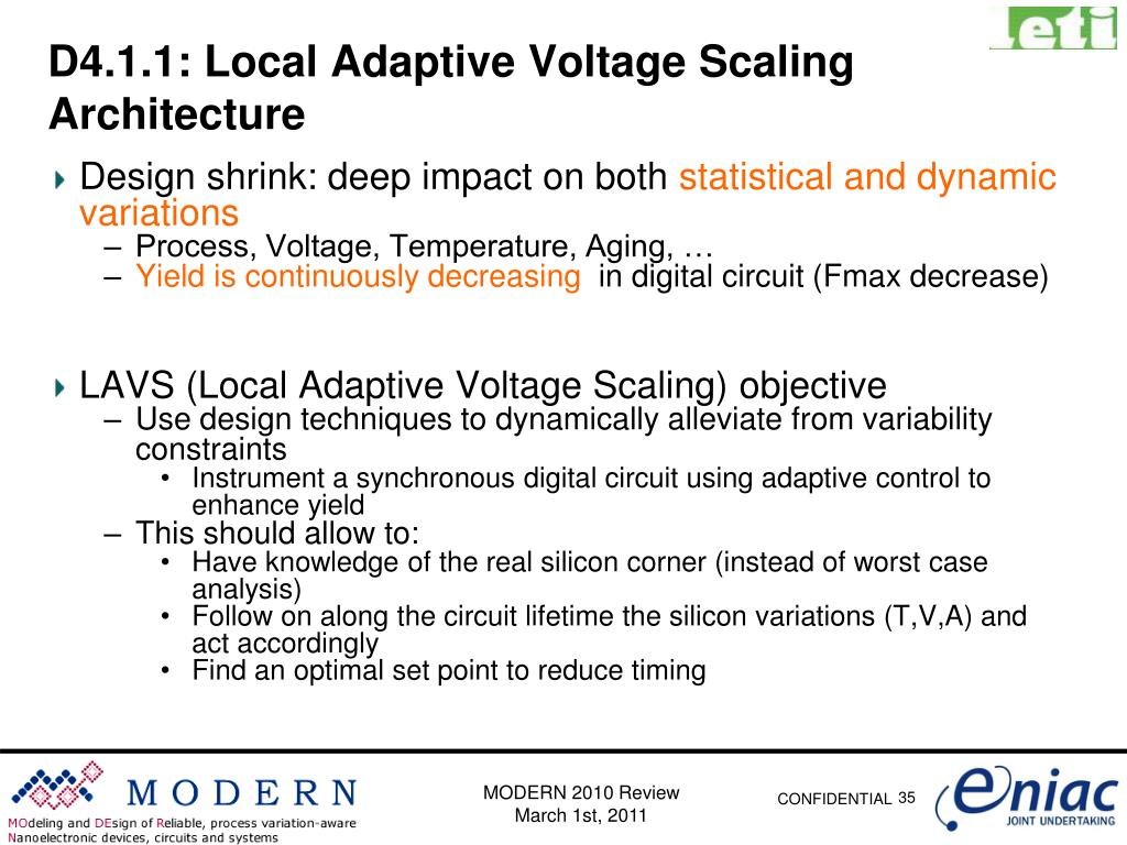 D4.1.1: Local Adaptive Voltage Scaling Architecture • Design shrink: deep impact on both statistical and dynamic variations • Process, Voltage, Temperature, Aging, … • Yield is continuously decreasing in digital circuit (Fmax decrease) • LAVS (Local Adaptive Voltage Scaling) objective • Use design techniques to dynamically alleviate from variability constraints • Instrument a synchronous digital circuit using adaptive control to enhance yield • This should allow to: • Have knowledge of the real silicon corner (instead of worst case analysis) • Follow on along the circuit lifetime the silicon variations (T,V,A) and act accordingly • Find an optimal set point to reduce timing MODERN 2010 Review March 1st, 2011