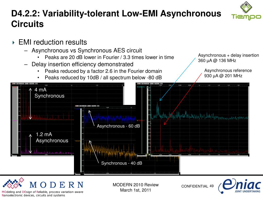 D4.2.2: Variability-tolerant Low-EMI Asynchronous Circuits Asynchronous + delay insertion 360 µA @ 136 MHz Asynchronous reference 930 µA @ 201 MHz 4 mA Synchronous Asynchronous- 60 dB 1.2 mA Asynchronous Synchronous - 40 dB • EMI reduction results • Asynchronous vs Synchronous AES circuit • Peaks are 20 dB lower in Fourier / 3.3 times lower in time • Delay insertion efficiency demonstrated • Peaks reduced by a factor 2.6 in the Fourier domain • Peaks reduced by 10dB / all spectrum below -80 dB MODERN 2010 Review March 1st, 2011