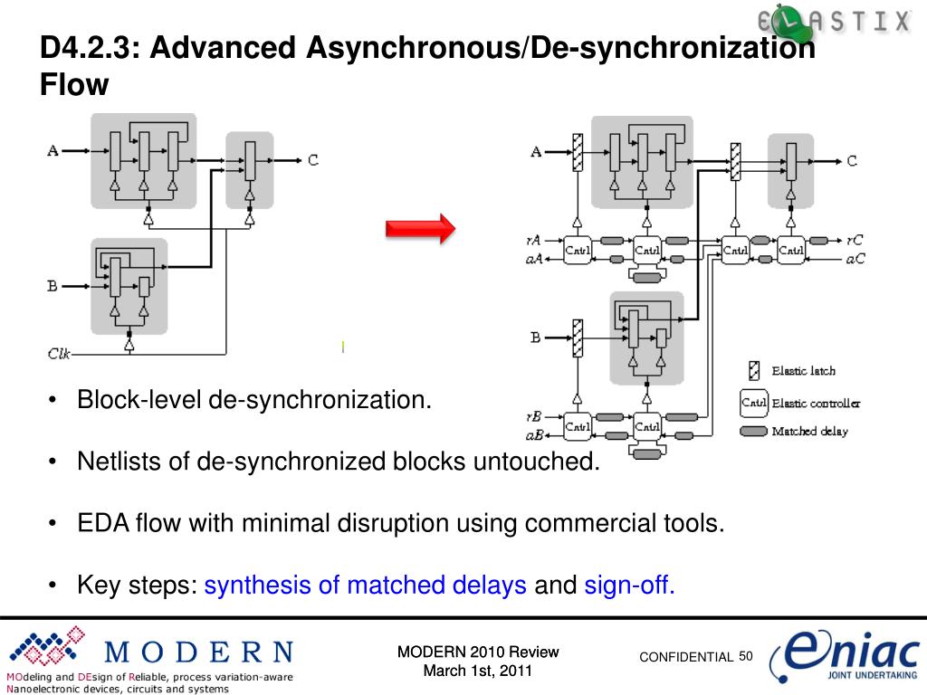 D4.2.3: Advanced Asynchronous/De-synchronization Flow • Block-level de-synchronization. • Netlists of de-synchronized blocks untouched. • EDA flow with minimal disruption using commercial tools. • Key steps: synthesis of matched delays and sign-off. MODERN 2010 Review March 1st, 2011 MODERN 2010 Review March 1st, 2011